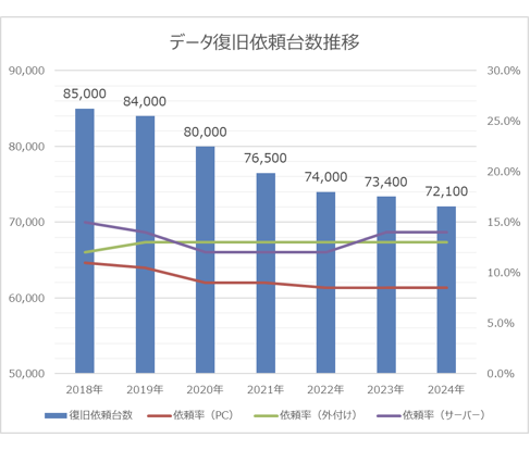 調査の結果、2024年における業界全体のハードディスクドライブ(HDD)およびソリッドステートドライブ(SSD)の復旧依頼台数は、72,100台(パソコン 54,300台、外付け15,200台、サーバー2,600台)と推定した。